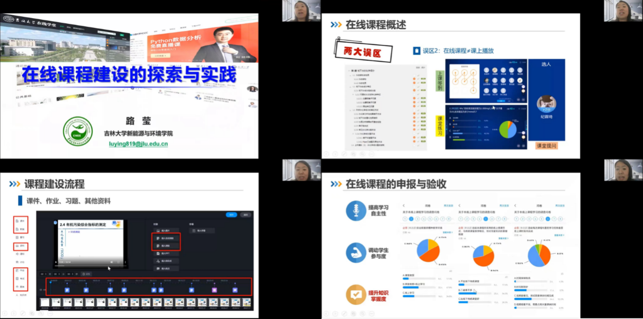 精品在线课程称号。路老师的报告结合自身在线课程建设的亲身经历和体验,分别从在线课程建设准备、在线应用与课程申报和验收三个方面展开。首先,分享了其在课程建设准备阶段如何操作平台,快速建课、如何进行知点点碎片化和视频录制;然后着重就如何借助线上线下混合方式提高学生参与度的具体方法提出了切实可行的建议;最后以个人两门在线课程的申报书和验收报告为实例,详细介绍了每个环节中遇到的问题和解决办法,为老师们今后更好地开展在线课程建设与申报提供有益帮助。