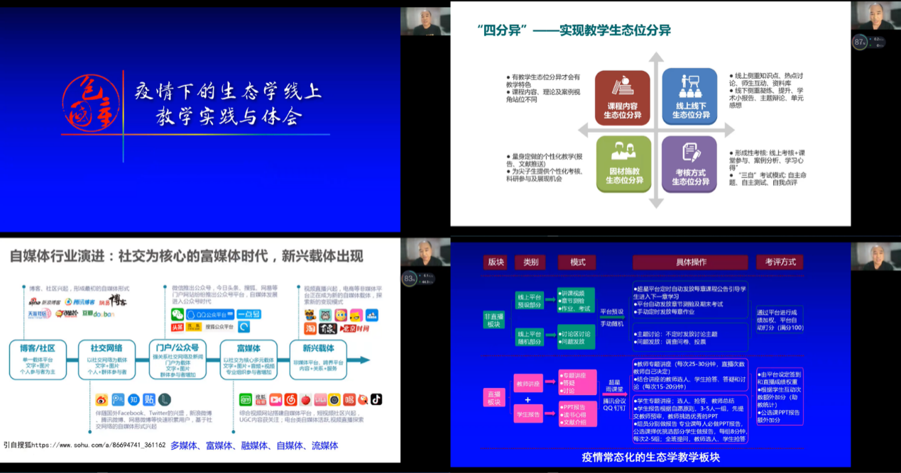 包国章教授做了题为“疫情下的生态学线上教学实践与体会”的教学报告。包老师是国家精品在线开放课程、国家级一流本科混合式课程、国家精品视频公开课、中国大学素质教育精品通选课及全国工程硕士课程负责人。包老师的报告分别从教学创新、针对疫情的教学实践以及如何融入课程思政三个方面分享了线上教学的创新理念和创新实践。介绍了教学中心及考学关系的转变、讲课层次的提升、关联式教学、激励手段的多样化,分析了疫情期间课程录制、课堂生态及教学心理特点,展示了课程思政的“一中心、二层次、三结合”融入原则。