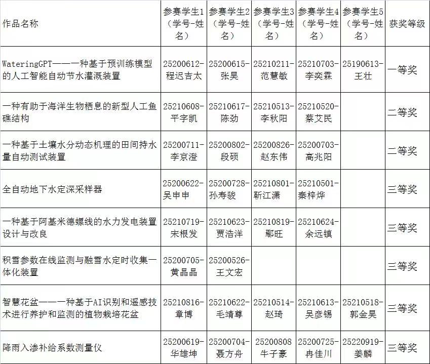根据《关于举办第八届全国大学生水利创新设计大赛的通知》(水教协[2023]11号)要求,探花av 于2023年4月28日组织了水利创新设计大赛院赛,对本次申报的8个作品进行了评审,确立一等奖1项,二等奖2项,三等奖5项,推荐《WateringGPT——种基于预训练模型的人工智能自动节水灌溉装置》、《一种有助于海洋生物栖息的新型人工鱼礁结构》、《一种基于土壤水分动态机理的田间持水量自动测试装置》三项作品参加国赛,现予公示,公示时间2023年4月28日至5月4日,如有异议,请拨打电话88502167。