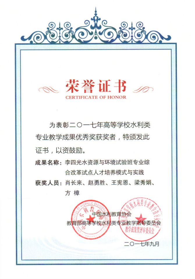获得奖项:2017年高等学校水利类专业教学成果奖优秀奖