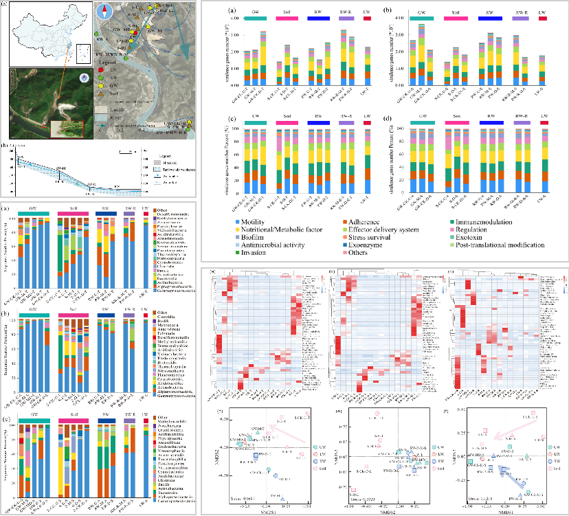 在地下水系统中,微生物的粒径差异和生物毒性会显著影响其迁移潜力及生物风险水平。然而,长期以来,微生物群落中有关细菌粒径及毒力多样性的研究仍显不足,导致地下水生物风险评估存在一定局限性与偏差。与此同时,地表-地下水相互作用所带来的水文复杂性、空间变异性及病原体传播的隐蔽性,也加剧了微生物在多孔介质中迁移机制的不确定性。研究团队聚焦典型山地型城市填埋场,结合水文地质学、环境微生物学和生物信息学等技术手段,构建了空间-水文-微生物三重耦合视角,系统考察了微生物尺寸对其在地表-地下水系统中迁移水平与生物风险的影响及其驱动机制。