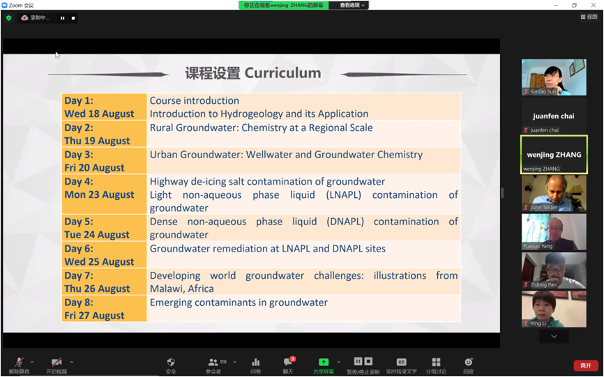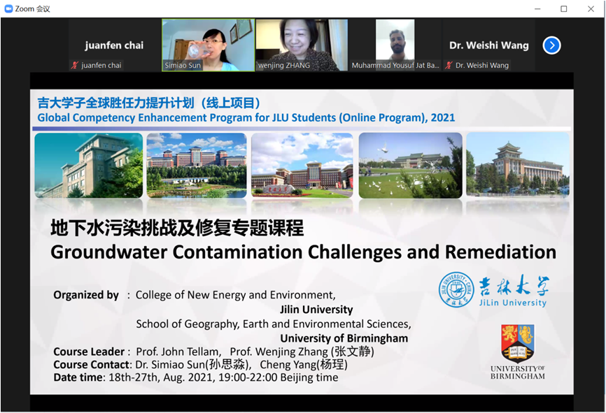 院长助理张文静教授、伯明翰大学地理地球和环境科学学院水文地质学科带头人 John Tellam教授,中英双方团队的杨悦锁教授、Michael Riley教授、Simiao Sun博士,以及学院负责研究生培养和国际交流的李莹老师、杨珵老师于2021年8月18日参加了开班仪式。本次线上课程是继前期中英学术坊等学术交流之后的持续性学术交流,双方相信在日后也能保持紧密的长期合作交流,希望吉大学子在地下水污染挑战及修复课上能够知惑解惑。