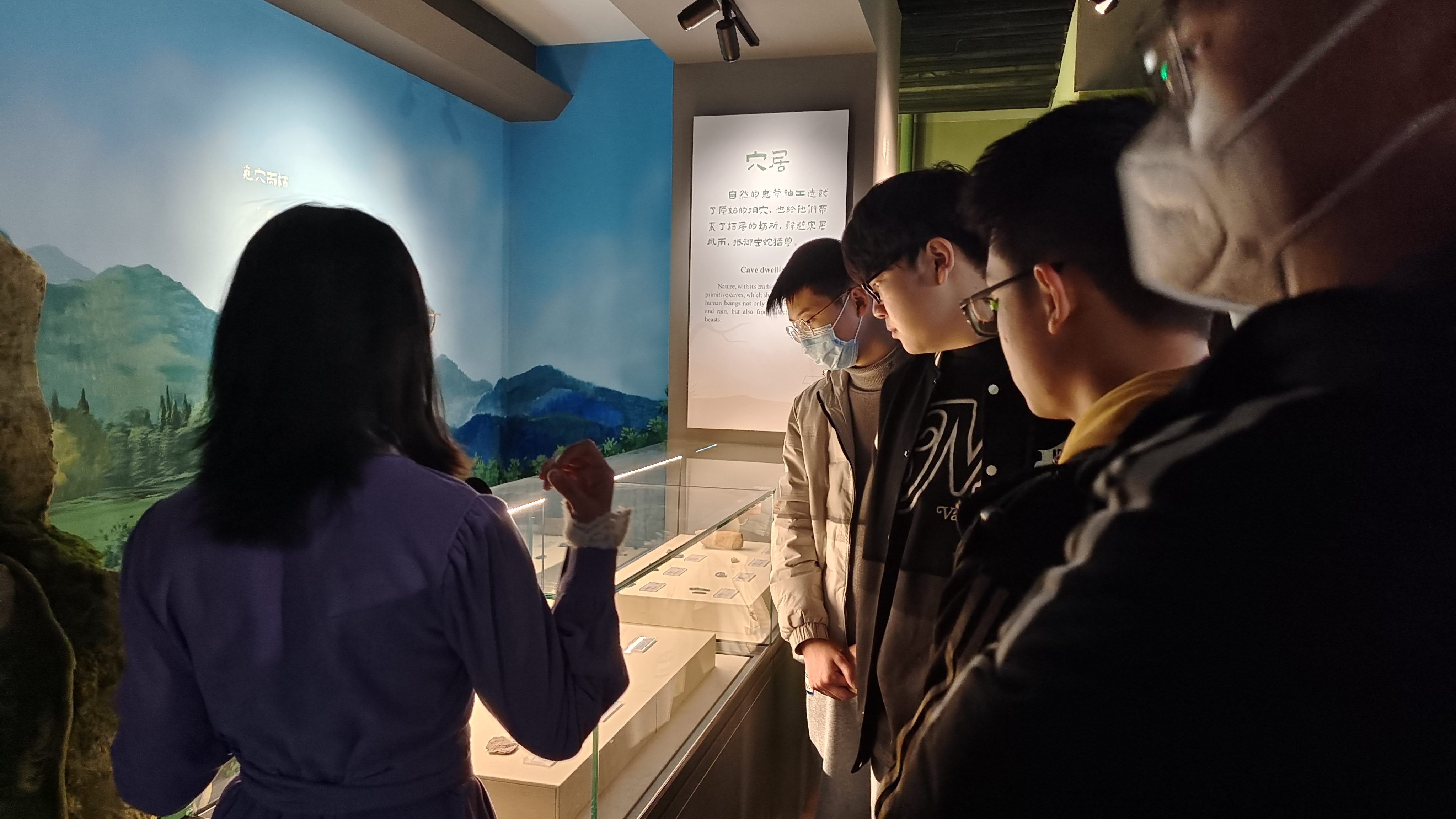 第二个展厅“绿野先踪——考古实证下的东北史前生活”描述了史前时期东北地区先民的居住方式,共分为“穴居、定居、聚居”三个单元,同学们通过参观体会到人类社会循序渐进的发展过程,同时感受到了史前人类的智慧。