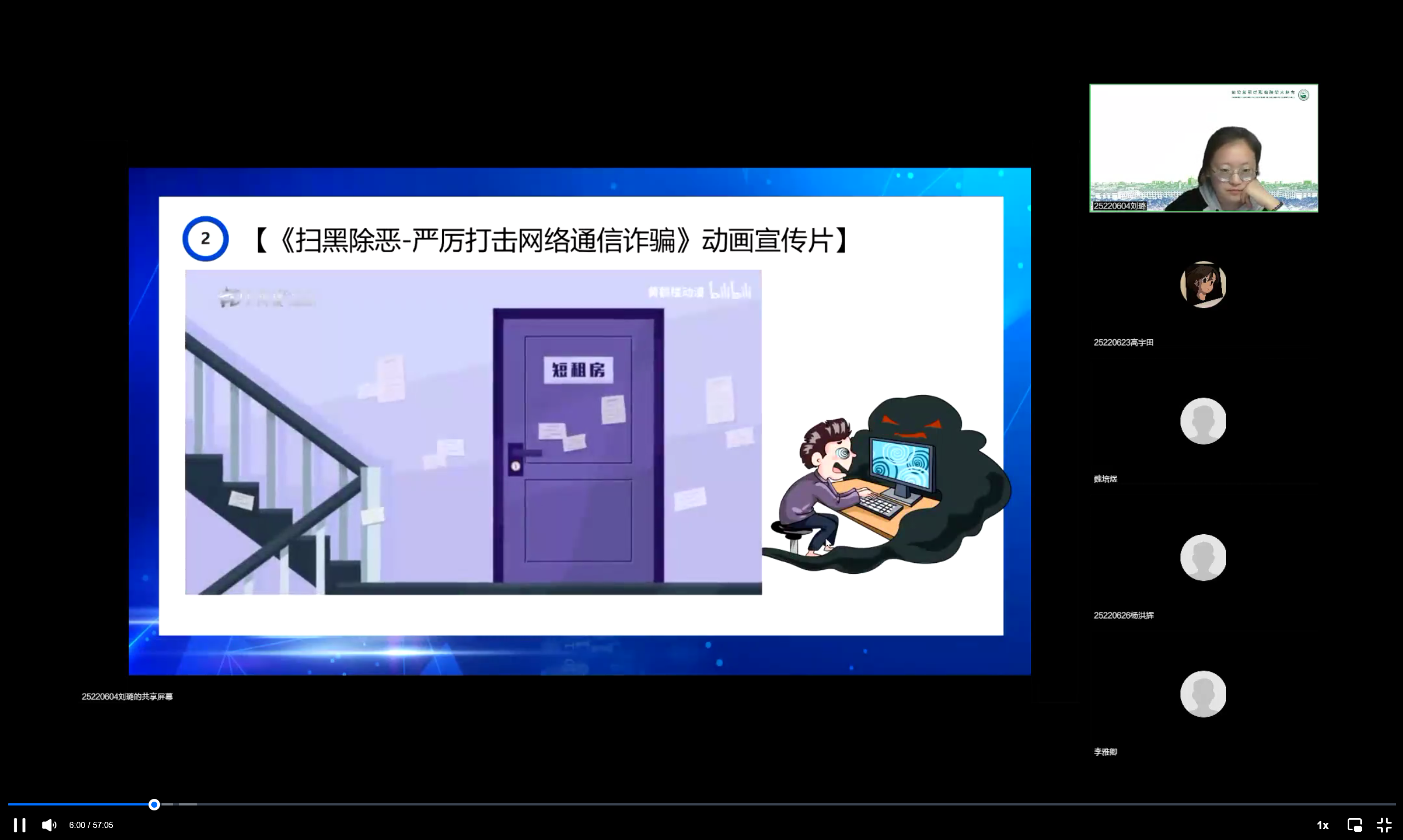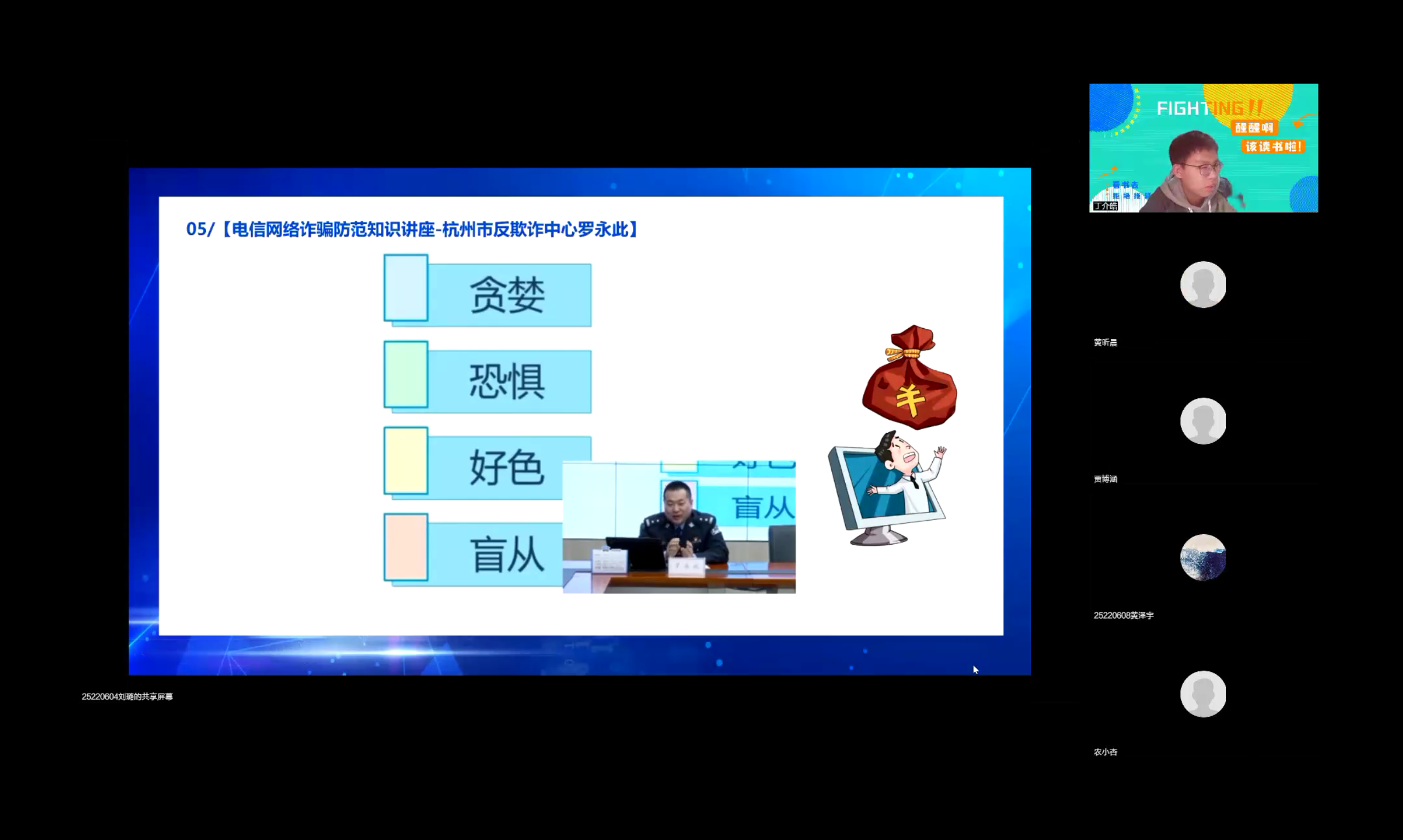 252206班同学在团支书刘璐的带领下,线上开展了以“防范诈骗擦亮眼 拒绝诱惑心不贪”为主题的团日活动。