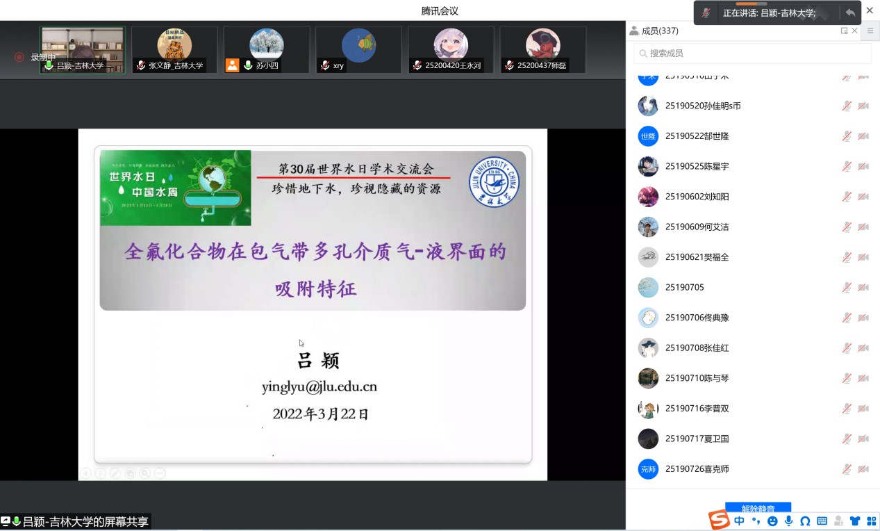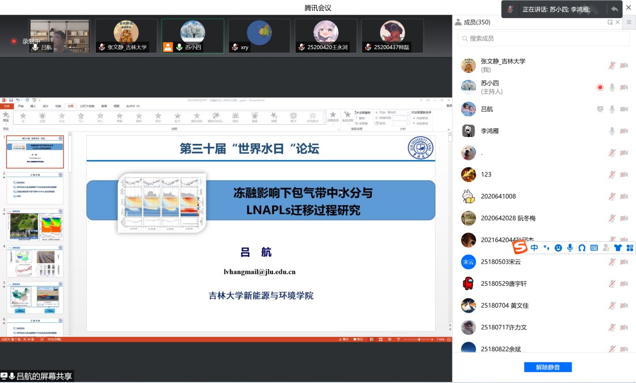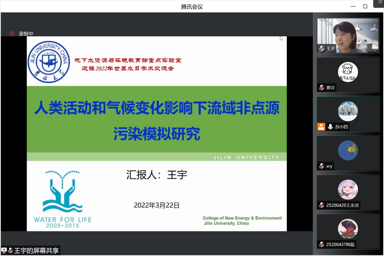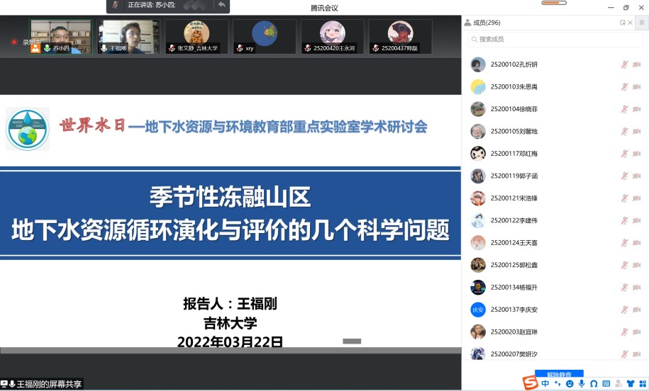 、水资源与环境研究所与地下水资源与环境教育部重点实验室共同组织召开了迎接2022年世界水日学术交流会。会议由水资源与环境研究所所长苏小四教授主持,学院领导、相关教师和研究生、本科生同学350余人在线参加了此次学术交流。