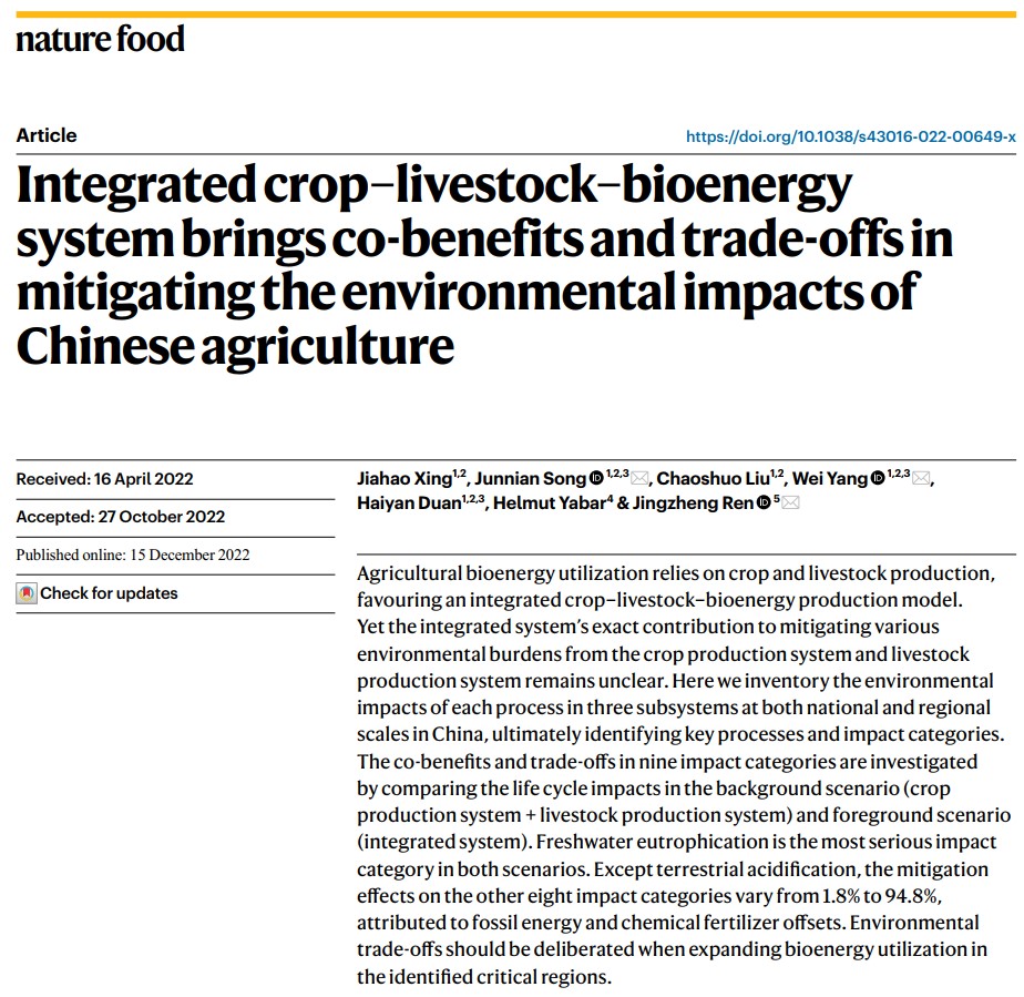 宋俊年教授研究团队领衔,与日本筑波大学、香港理工大学研究团队合作,在生物质能利用与农业环境影响研究领域取得重要进展,研究成果以“Integrated crop-livestock-bioenergy system brings co-benefits and trade-offs in mitigating the environmental impacts of Chinese agriculture”为题发表在Nature子刊《Nature Food》。探花av
