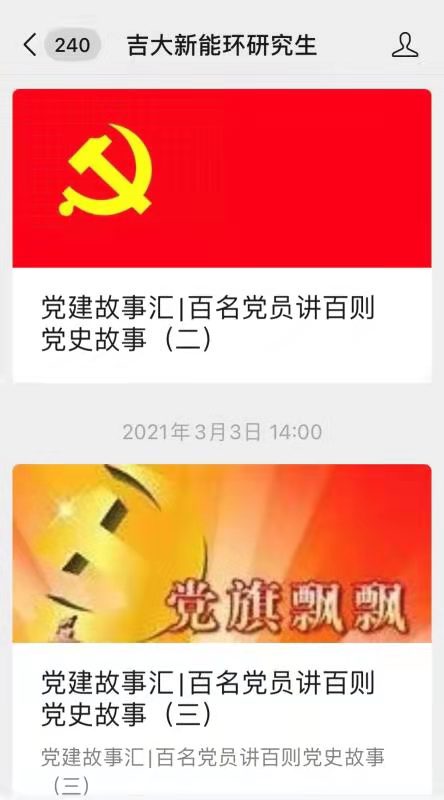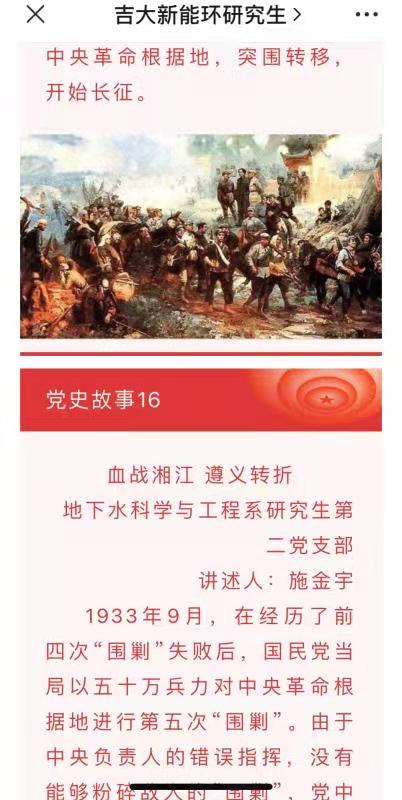 “吉大新能环研究生”微信平台推出了党建故事汇:百名党员讲百则党史故事活动,日前100名研究生党员的100篇故事和100张经典故事照片征集完毕,已在微信平台推送至第50篇党史故事。微信公众平台成为了学院研究生党员党史学习教育的新阵地。