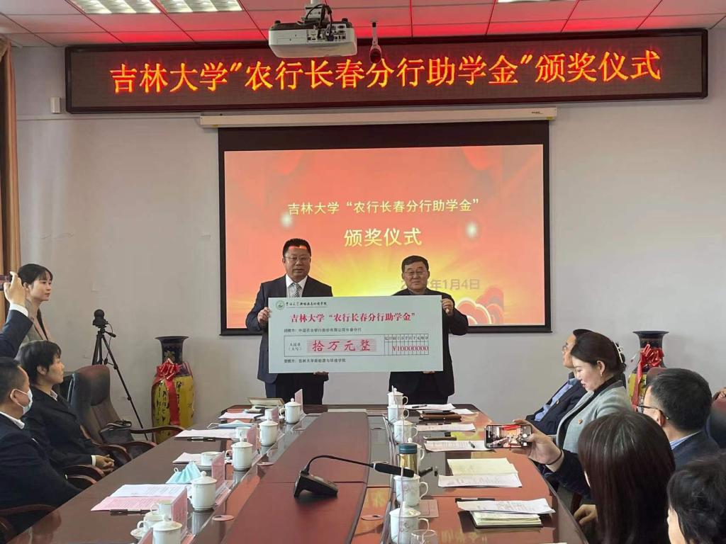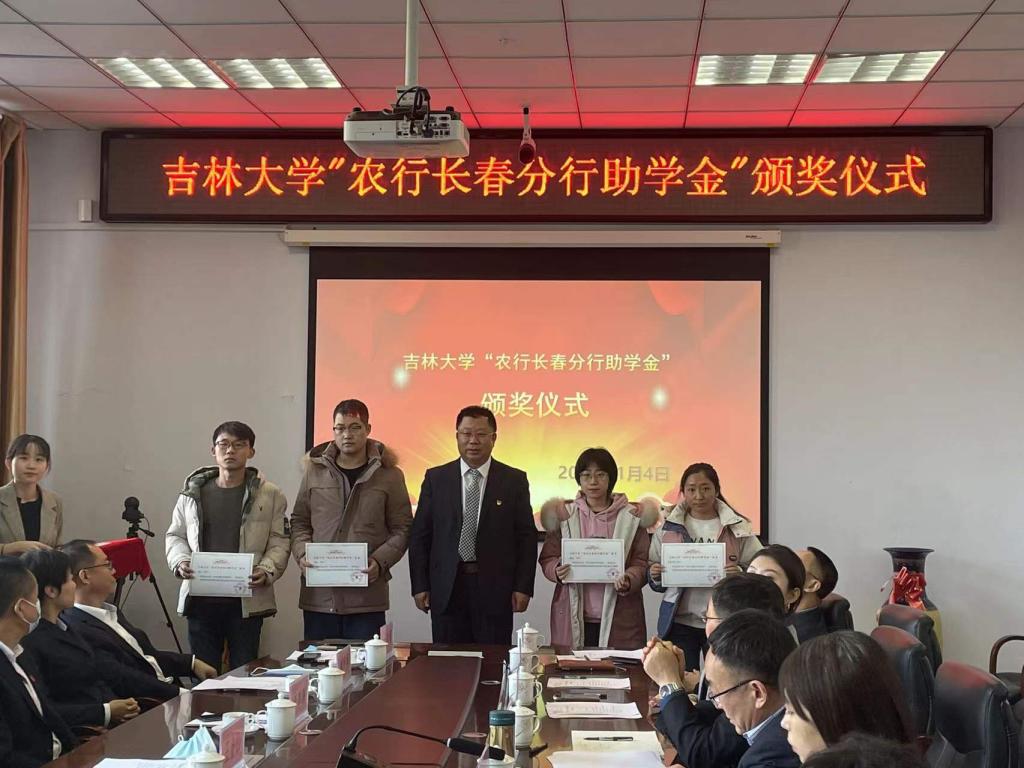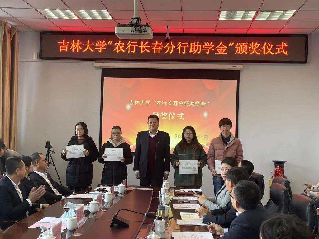 “农行长春分行助学金”,农行长春分行行长王金、副行长李韩鹏和韩宪军为学生颁发了助学金。2019级博士研究生梁旭代表获奖学生发言,感谢农行长春分行的捐赠和学院的培养,励志奋发图强,饮水思源,用实际行动为社会做更大的贡献。王金山行长在讲话中对探花av