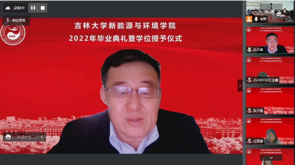 会议开始前,播放了毕业生在校期间的视频和照片,一幅幅照片、一个个镜头、一段段音乐勾起了老师和同学们美好的青春回忆。在师生们的期待与感动中,典礼正式开始。首先,全体起立奏唱《中华人民共和国国歌》。随后,花修艺教授和卞建民教授宣读了学院2022届毕业研究生和本科生名单,并对顺利毕业的同学表示祝贺。接着,同学们期待的学位授予仪式开始了,本次学位授予仪式采用线上制作动图的方式为毕业生拨穗。