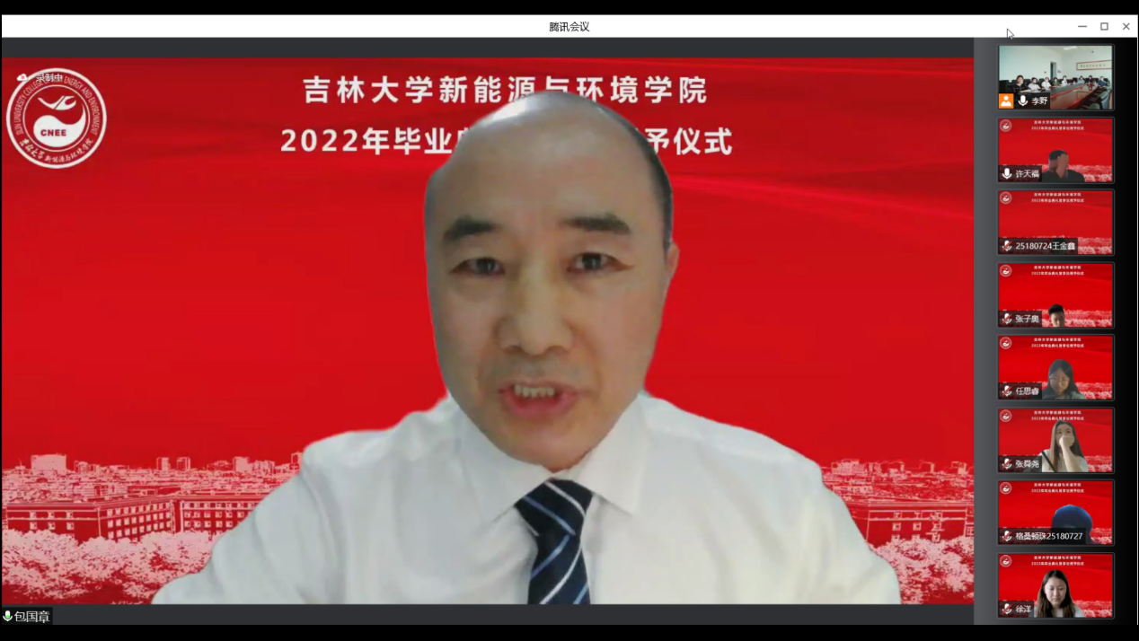 召开了2022届毕业典礼暨学位授予仪式。本次毕业典礼采取线上线下相结合的方式,主会场设在前卫北区理化楼260会议室,同时采取腾讯会议的形式邀请全院师生及广大毕业生参加。线上会场的领导和嘉宾有:学院院长、学位评定委员会主任许天福教授,学院学术委员会主任赵勇胜教授,学院教学委员会主任董德明教授,校友代表重庆大学土木工程学院杨忠平教授,以及学院教职员工和2022届毕业生。线下会场到会的领导和同学有:学院党委书记汪祥松及领导班子成员,以及毕业生代表王涵同学等。毕业典礼由学院党委副书记温卓主持。