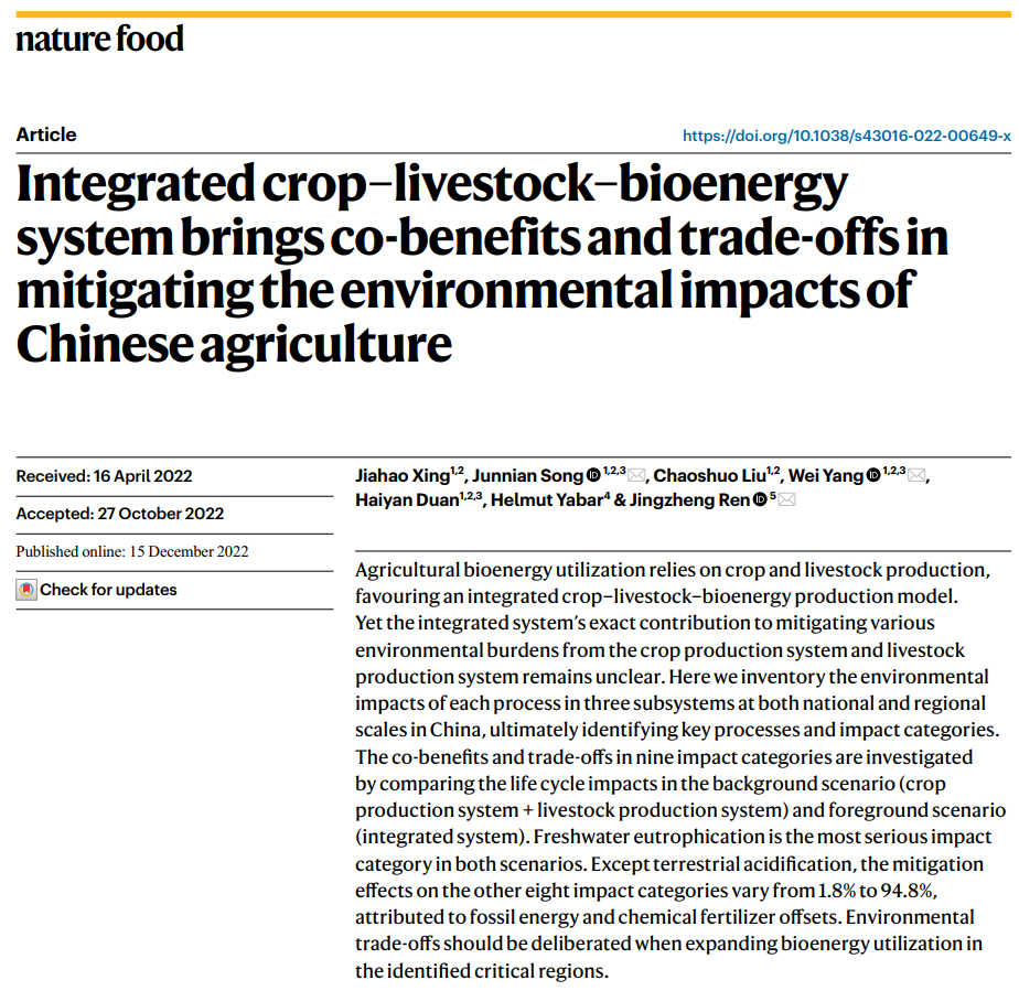 宋俊年教授研究团队领衔,与日本筑波大学、香港理工大学研究团队合作,在生物质能利用与农业环境影响研究领域取得重要进展,研究成果以“Integrated crop-livestock-bioenergy system brings co-benefits and trade-offs in mitigating the environmental impacts of Chinese agriculture”为题发表在农业与食物领域顶级期刊《Nature Food》。探花av