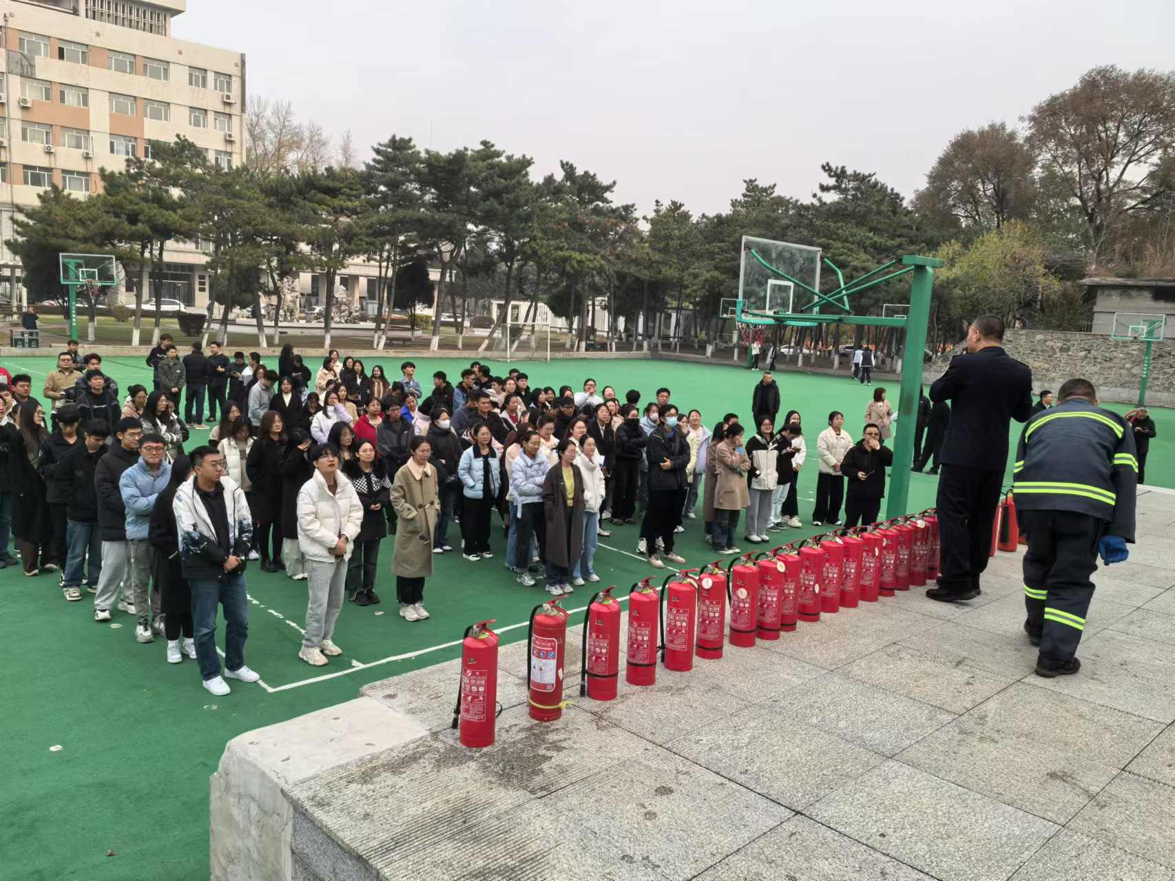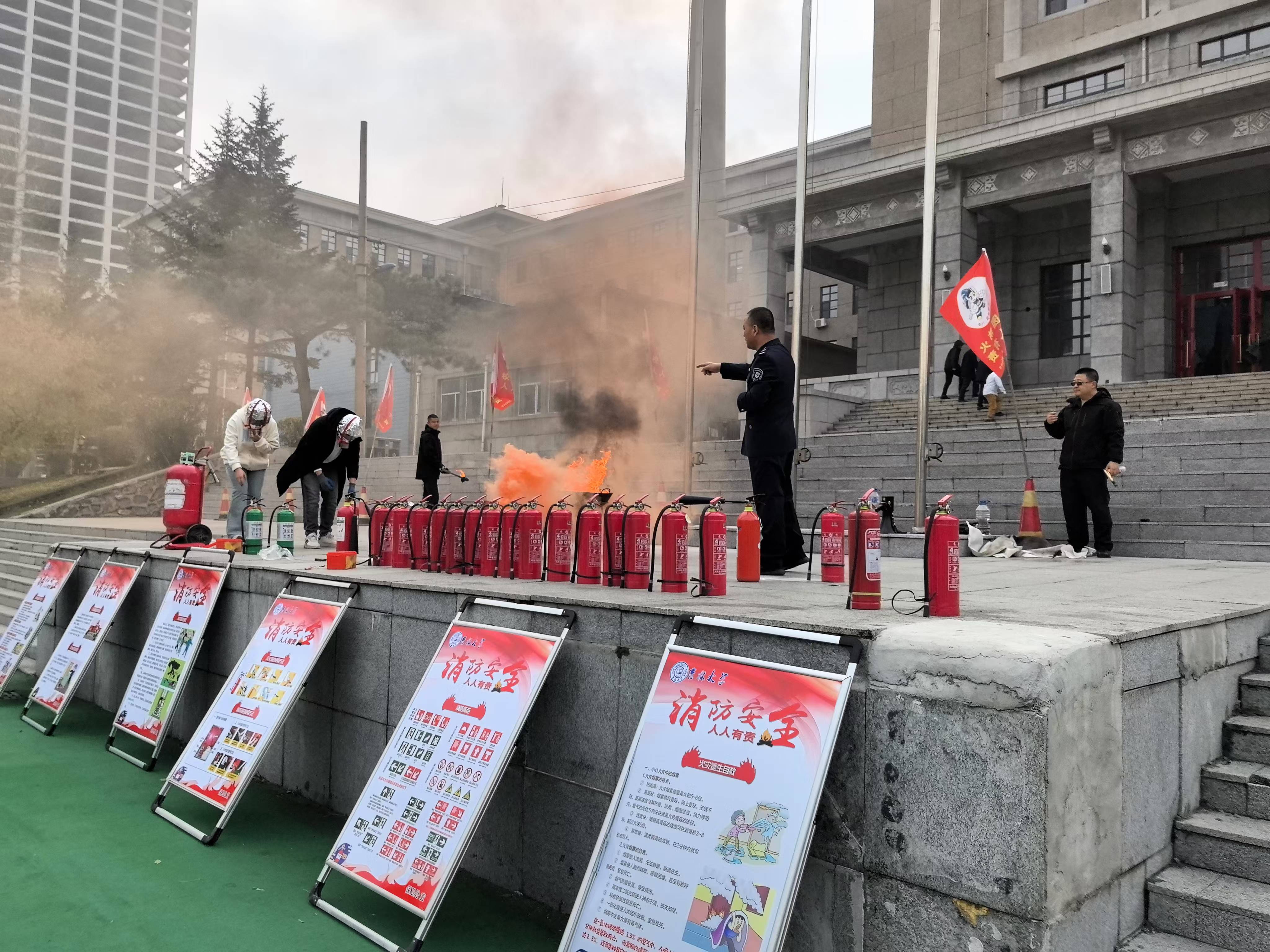 实战演习进行了烟雾逃生演练,模拟理化楼内发生“火情”,楼内教职工、学生和后勤人员迅速展开自救,同时疏散引导组成员打开应急疏散逃生门,各楼层组织人员疏散逃生;学校保卫处接到报警后迅速启动《探花av 消防救援应急预案》,组织保卫人员及时赶到现场进行救援处置,并在北操场举行了灭火实战演。