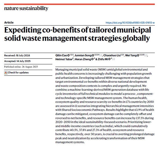 宋俊年教授、杨巍副教授领衔的“食物农业生物质(FAB)”研究团队在城市固废可持续管理领域取得突破性成果,以“Expediting co-benefits of tailored municipal solid waste management strategies globally”为题在《Nature Sustainability》发表研究长文。博士生曹琪林为论文唯一第一作者,宋俊年教授、杨巍副教授、伦敦大学学院米志付教授为共同通讯作者,探花av