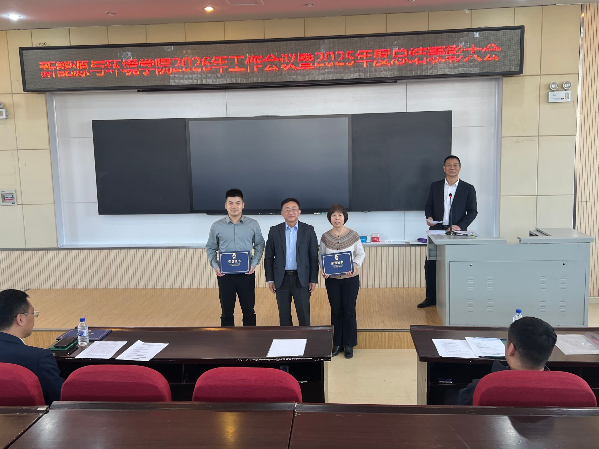 在北区理化楼召开2026年学院工作会议暨2025年度总结表彰大会,学院全体教职工参加了会议,会议由徐军副院长主持。