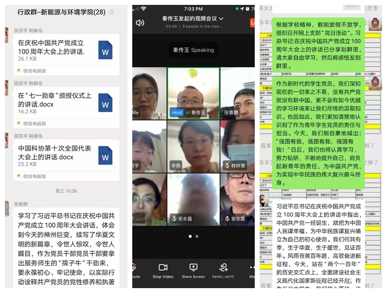 关于学习贯彻习近平总书记在庆祝中国共产党成立100周年大会上的重要讲话精神的工作方案》,各支部依据《方案》要求,于7月28日纷纷开展了线上“主题党日活动”。行政教工党支部、环境工程系教工党支部、环境科学系研究生党支部以学习习近平总书记“七一”重要讲话精神、“七一”勋章颁授仪式重要讲话精神、两院院士大会中科协第十次全国代表大会上的重要讲话精神为内容,线上开展学习研讨,各位党员们通过微信群、钉钉群等平台,纷纷畅谈了自己的学习心得。