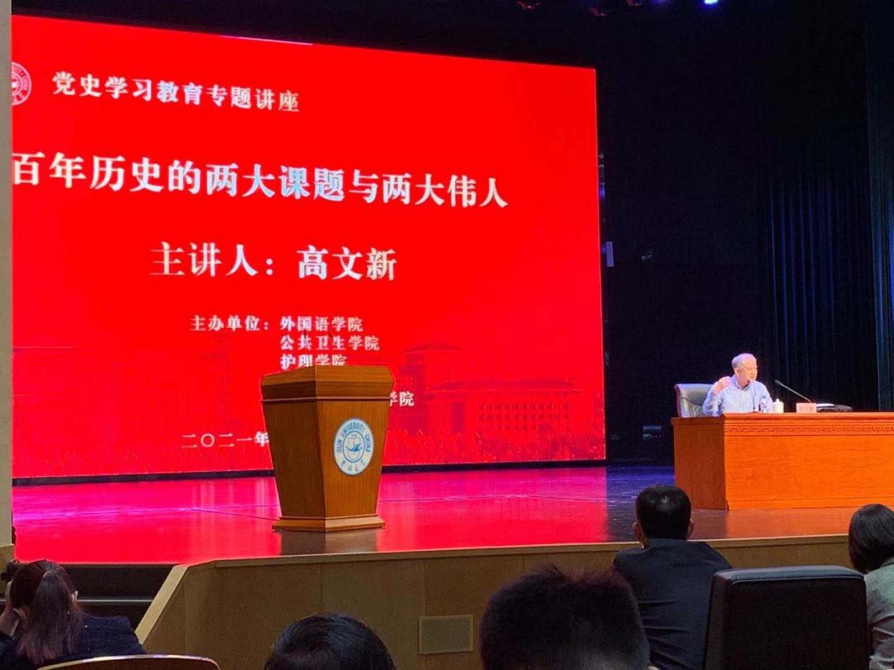 马克思主义学院教授、博士生导师高文新老师讲授,高文新教授先后被评为优秀教师,吉林省教育系统师德标兵和师德先进个人,多次获省、校科研成果奖和学校教学奖,本次讲授主题为“百年历史的两大课题与两大伟人”。