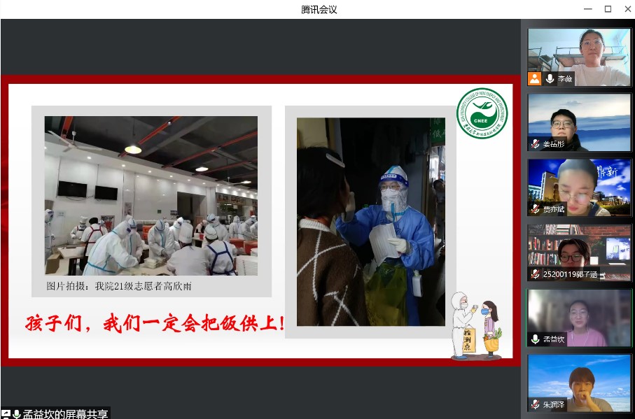 活动伊始,党支部组织委员兼宣传委员牛梦圆同学带领大家一起学习了《致全省各级党组织和广大共产党员的一封信》以及《致全校各级党组织和广大党员的倡议书》。随后,四位党员志愿者代表分别分享了自己的战疫故事。孟益坎同学向大家展示了几组图片,讲述了自己从看到老师同学们积极参与疫情防控到自己和室友们一起参与防控的故事,分享了自己在清晨为大家发放完早餐后获得的自豪和光荣。她用“聚是一团火,散是满天星”形容一直奋战在校园疫情防控第一线的志愿者。一直驻校工作的钟宇博老师也分享了他这段时间的工作感受,他最后说“我们终会在春暖花开的校园里,迎接探花av