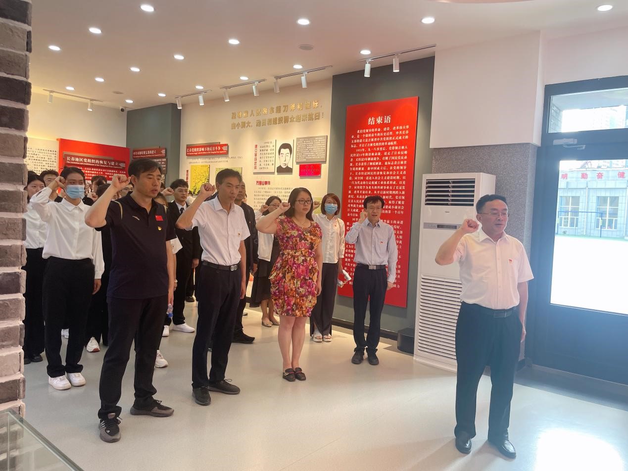 中共长春支部纪念馆位于长春市南关区树勋小学校内,整个展馆布景以灰、红两色为主基调,展陈了从1921年至1931年期间,中国共产党在血与火的斗争淬炼中,领导长春人民为争取独立自由而前仆后继的风雨历程。党员们认真聆听了小讲解员铿锵有力地宣讲,先后参观了“风雨如磐”“艰辛探索”“长夜星火”“红色脊梁”4个篇章展区,通过展板、实物、情景再现等多种形式,全方位学习了中共长春支部诞生等重要历史事件,重温了那段刻骨铭心的艰苦岁月,再一次经受了共产党人坚定的理想信念、拳拳的爱国之心和大无畏的革命精神的洗礼,越发坚定了大家传承红色血脉、踔厉奋发新征程的精神动力。参观结束后,面对党旗,学院党委书记汪祥松带领大家重温入党誓词,响亮的誓言铿锵有力,激情与责任萦绕心头。