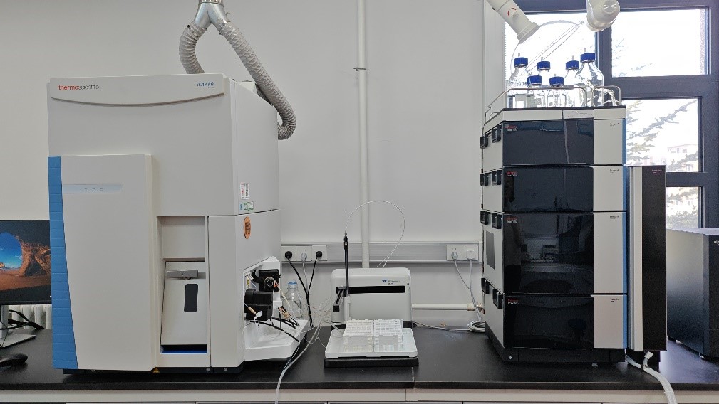 一、高效液相色谱配有四元泵,工作原理为串联双柱塞,流量范围:0.001-10.000 mL/min,步进0.001 mL/min,流量精密度:<0.05% RSD or <0.01 min SD,最大压力:70Mpa (700 bar, 10100 psi);帕尔贴结合空气循环模式、直热模式,即双模式温控,温控范围:5-85℃,配有自动进样器,二极管阵列检测器(波长范围:190-800 nm)和荧光检测器(激发波长:200-880nm,发射波长:265-900nm),独立色谱工作站。可与电感耦合等离子体质谱仪联用,也可单独使用。