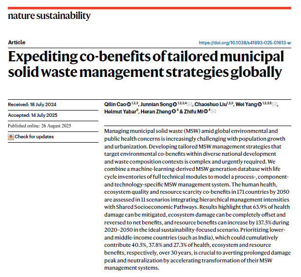 宋俊年教授、杨巍副教授领衔的“食物农业生物质(FAB)”研究团队在城市固废可持续管理领域取得突破性成果,以“Expediting co-benefits of tailored municipal solid waste management strategies globally”为题在《Nature Sustainability》发表研究长文。博士生曹琪林为论文唯一第一作者,宋俊年教授、杨巍副教授、伦敦大学学院米志付教授为共同通讯作者,探花av