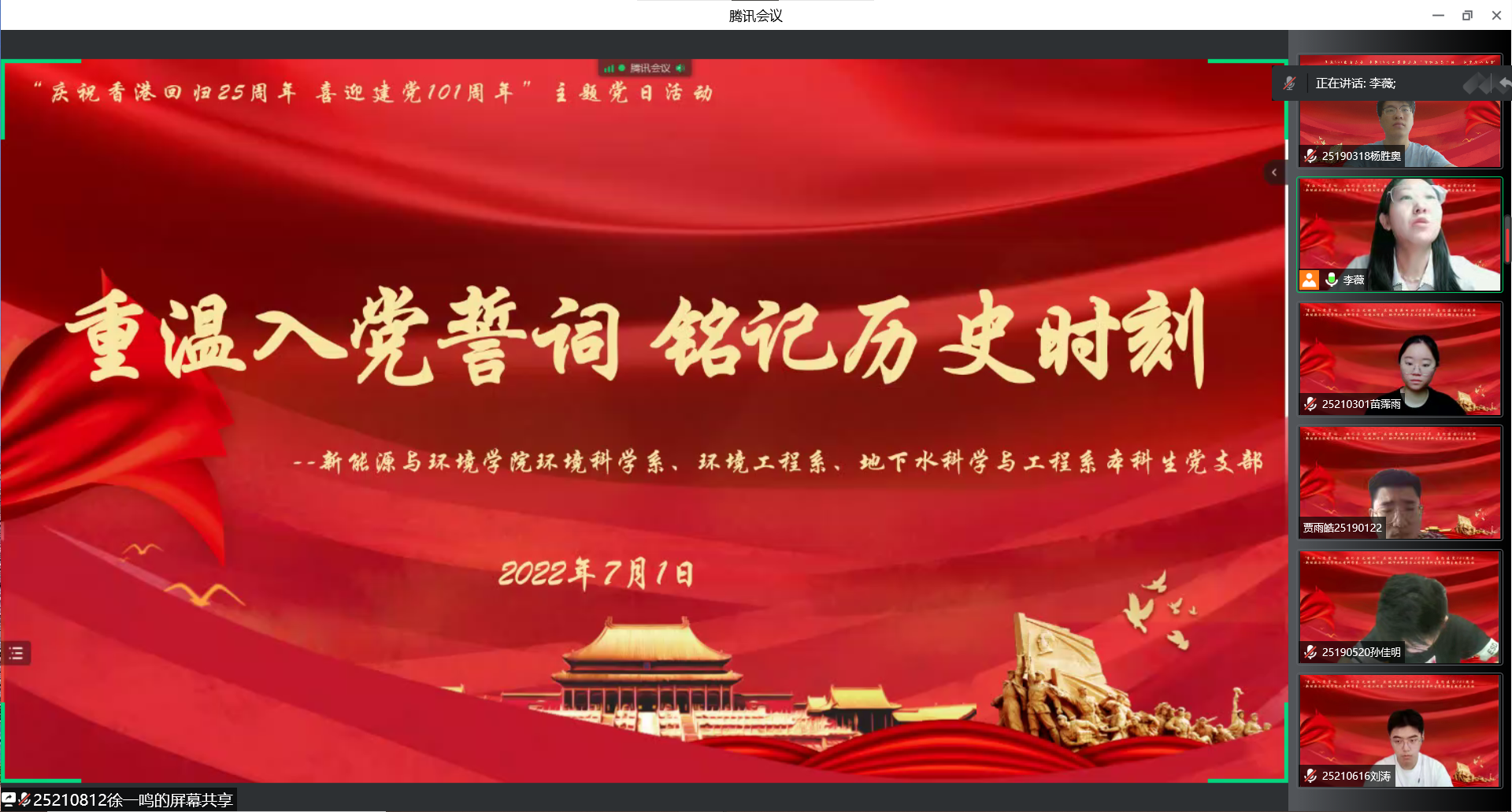 会后,学生们分享了自己的心得体会。入党积极分子贺群表示,我们生在红旗下,生于春风中,以青春之名,书写清澈挚爱,以心中红星献礼中国。人民有信仰,国家有力量,民族有希望,目光所至,皆为华夏,五星闪耀,皆为信仰。祝祖国繁荣昌盛,香港明天更美好,祖国明天更美好;党员王美怡表示,重温入党誓词,更让我坚定了为中华之崛起而读书的信念,没有共产党就没有新中国,正是党带领人民一刻不停地建设祖国,才有了祖国飞速发展的今天。中华民族的伟大复兴,是中国人民质朴而美好的愿望,我也一定要将自己的力量汇入到实现这份纯粹真挚的中国梦的万千力量中去。